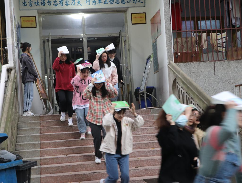 17:30,警报声响起,学生头顶书本从宿舍楼里按照逃生路线开展逃生演练活动,演练过程中同学们动作敏捷、行为规范。演练结束后,崔主任为同学们讲解了此次演练的目的及意义,肯定了同学们能够井然有序并且顺利地完成演练的正确态度,并希望大家在遇到真实突发状况时也能从容应对,将本次活动学到的知识运用到生活中。