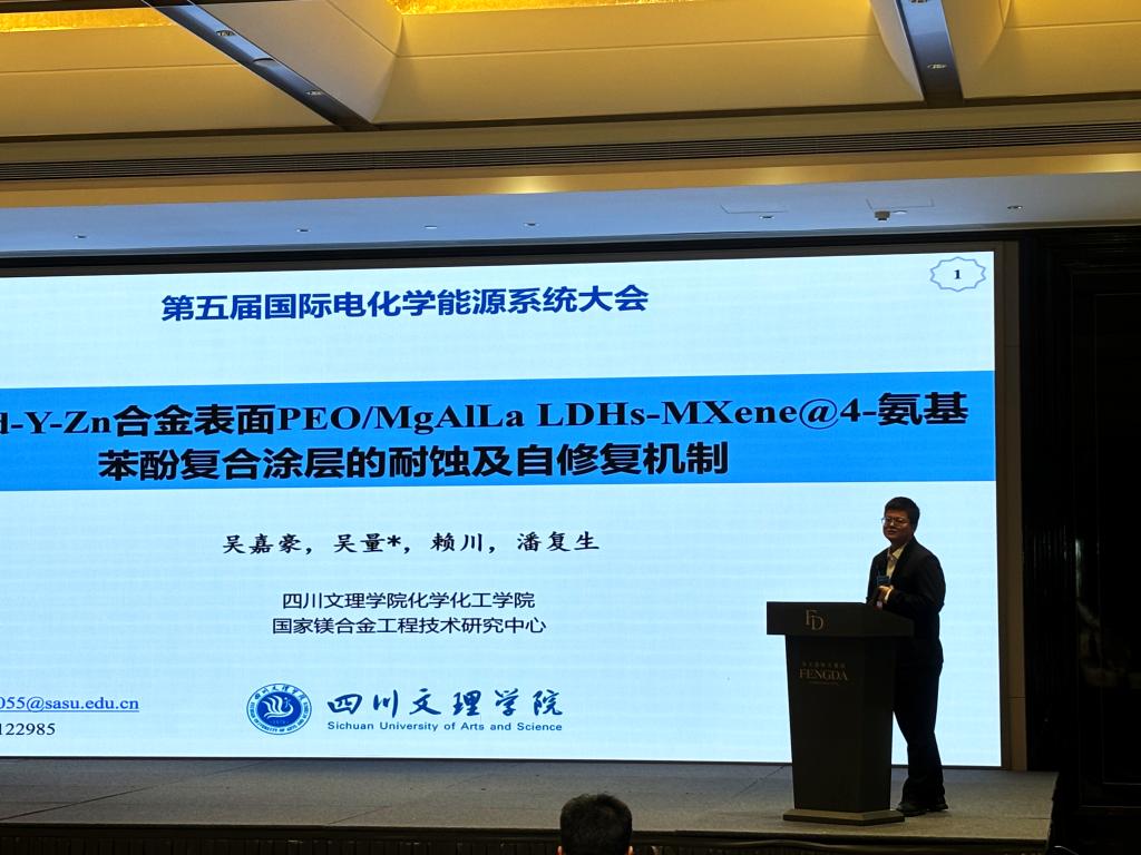 本次大会由东南大学、国际储能材料学会、上海交通大学绍兴新能源与分子工程研究院、北京化工大学化学学院等29家单位主办,由东南大学能源与环境学院、北京理工大学长三角研究院(嘉兴)、湖南文理学院、江苏理工学院、长春理工大学材料科学与工程学院和四川文理学院万象城awcsport官网承办和协办。重庆大学潘复生院士向大会致辞,杨裕生院士、成会明院士、俞书宏院士、Prof.0liver G.Schmid 院士、Prof.Ho Seok Park院士等出席大会并做主旨报告。其中,吴嘉豪博士代表四川文理学院万象城awcsport官网在会议上做了题为“Mg-Gd-Y-Zn合金表面PEO/MgAlLa LDHs-MXene@4-氨基苯酚复合涂层的耐蚀及自修复机制”的报告,为涂层的电化学腐蚀测试和微区电化学技术的功能应用提出了创新性思路,获得了与会同行和专家的高度评价。
