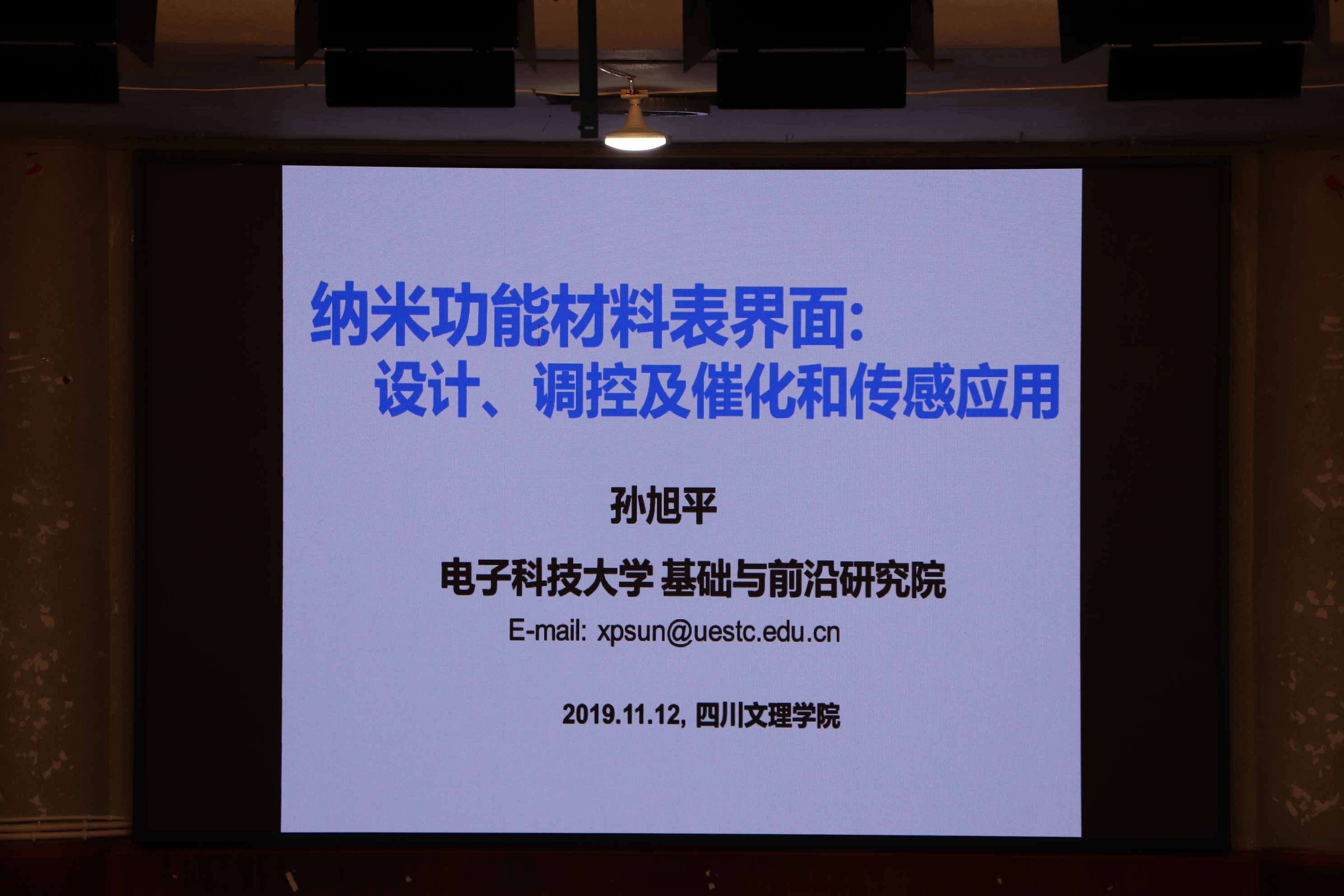 应四川文理学院万象城awcsport官网邀请,电子科技大学基础与前沿研究院孙旭平教授于2019年11月12日到访万象城awcsport官网并进行学术交流。晚上19:00孙旭平教授在南坝校区学术报告厅做了“纳米功能材料表界面:设计、调控及催化和传感应用”的专题报告。万象城awcsport官网党总支书记朱朝菊,副院长邓祥及万象城awcsport官网300余名师生代表聆听报告会。报告会由万象城awcsport官网院长刘长路主持。