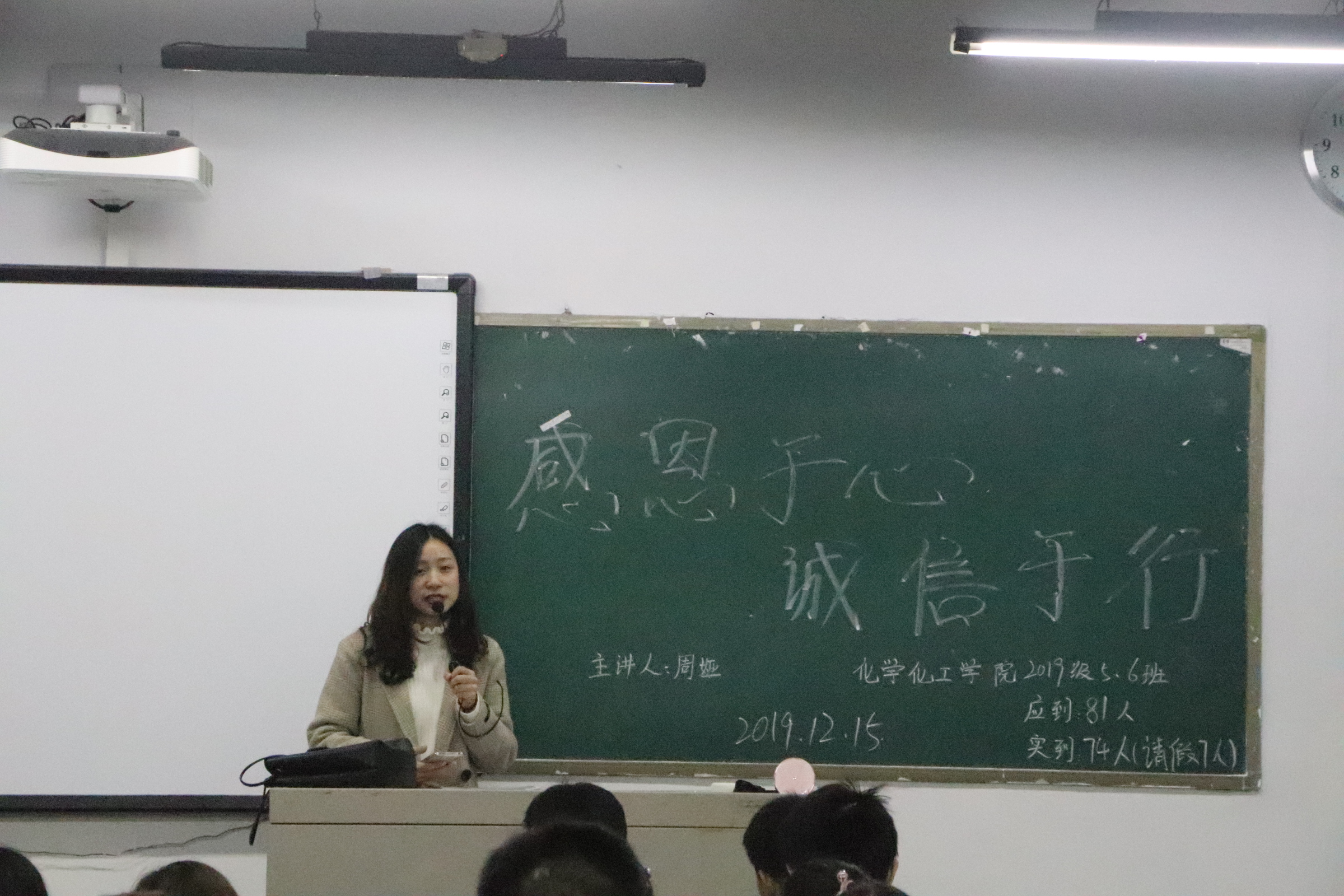 为抓文明诚信考风,促认真严谨学风,树博学笃志校风,营造良好期末考试氛围,充分发挥学生资助工作的育人和导向功能,加强对受资助学生感恩和诚信教育,促进受资助学生积极践行社会主义核心价值观,加强大学生诚信感恩教育,引导学生树立求真务实、言行一致的诚信形象。2019年12月15日,万象城awcsport官网在南坝校区开展“感恩于心,诚信于行”的主题班会。