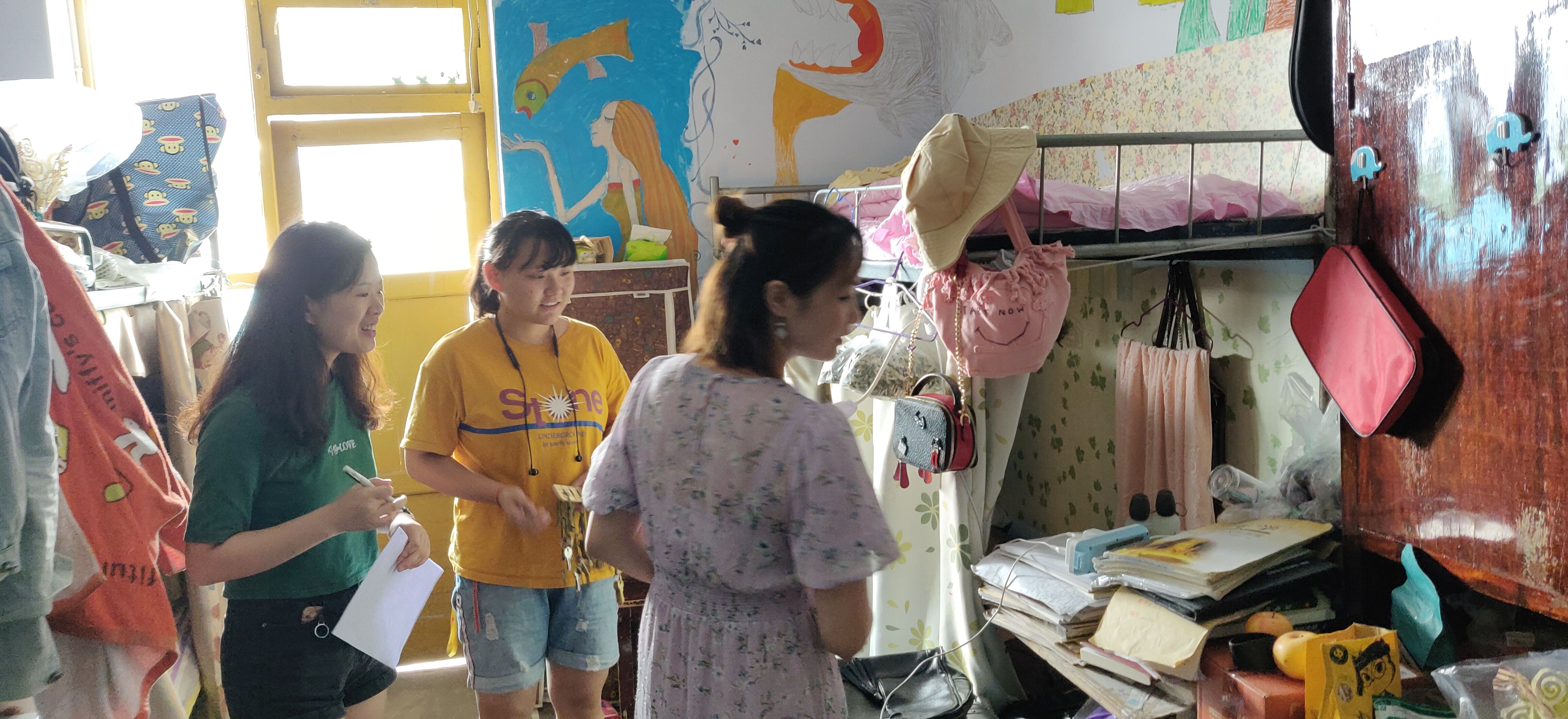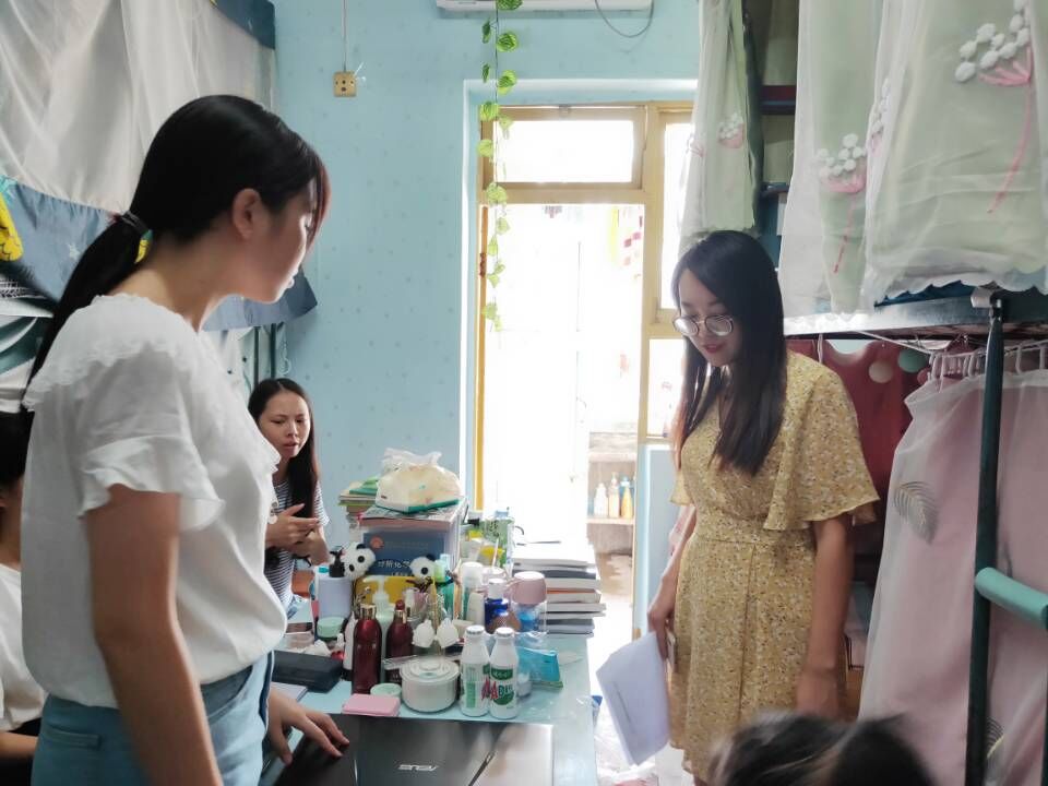付琼瑶老师和张魏霞老师在进入女生寝室后,对干净整洁的女生寝室提出表扬,并强调了安全、卫生等问题的重要性。并给同学们提出建议,如离开寝室时切断电源,寝室要经常通风换气,垃圾要及时清理,并特别强调禁止在寝室使用大功率电器等,最后老师们还提出,希望同学们在新的一学期里展现出当代大学生的新风貌,同时也希望同学们积极发言,主动表现自我。如在生活或是学习方面有任何问题,都可以随时联系老师。