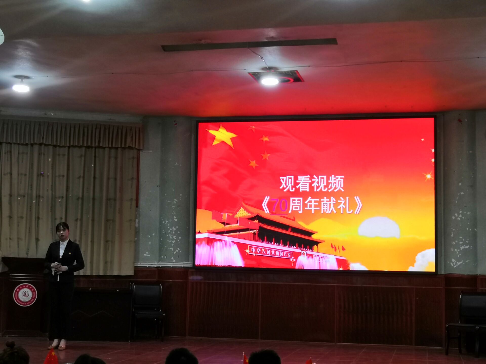 解说员解说了主题团日活动流程,全体学生激情饱满地合唱了团歌,重温了入团誓词,回温入团荣誉。李延川同学进行“国旗下的演讲”,讲述了中国在新中国成立70周年以来发生的巨大变化。这一段70年的时光,是一代代中国人经历了贫穷短缺、温饱不足,最终进入小康的岁月。他在演讲中回顾了新中国在这70年来取得的伟大成就,我们忘不了氢弹、原子弹的研制,忘不了香港和澳门的回归,忘不了中国成功发射天宫二号的太空行程。