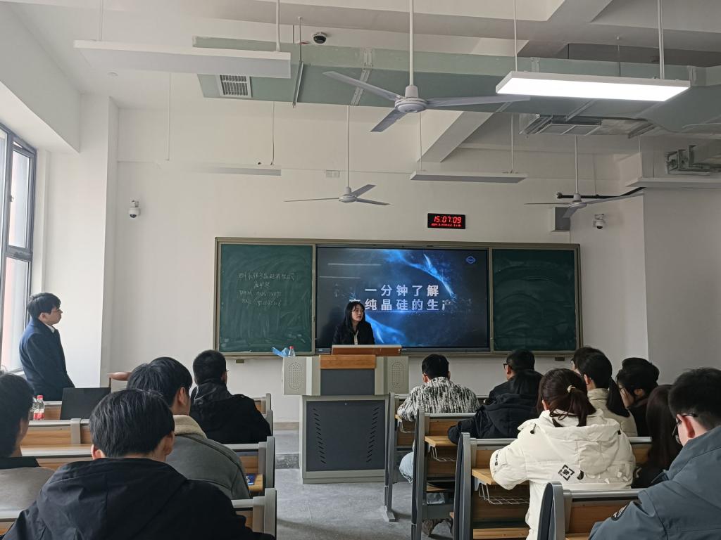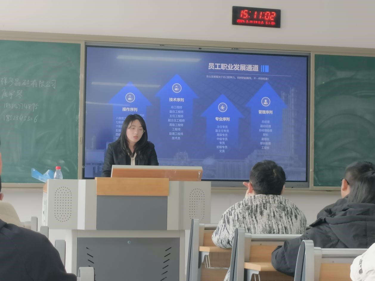 招聘会伊始,招聘经理庞宇琴以视频的形式展示了高纯晶硅的生产过程,并结合PPT向毕业生们介绍了公司培养新人的成长路径图、公司的发展前景等。随后,招聘经理庞宇琴向毕业生们播放了该公司的“朝阳计划”集训视频,同学们热情高涨。此次招聘主要针对应用化学和化学工程与工艺专业。万象城2019级优秀毕业生曾伟学长结合在该公司的成长经历为同学们答疑解惑,现场气氛和谐融洽。