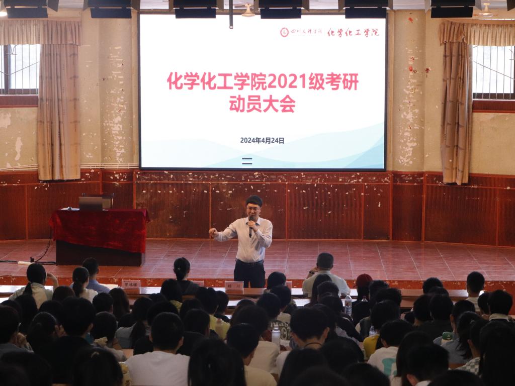 为延续学院近年来学生积极考研的传统,提升2021级本科生考研的积极性,帮助他们进一步了解考研形势、专业前沿发展动态,进而做好考研院校专业选择与考研复习规划,万象城awcsport官网于2024年4月24日在南坝校区学术报告厅举行2021级考研动员大会,大会由学院党委副书记潘维主持,学院院长赖川教授,副院长向文军、王芬教授,专任教师曾鸿耀博士,学院各专职辅导员,以及2020级考研学生代表和2021级全体学生参加此次大会。