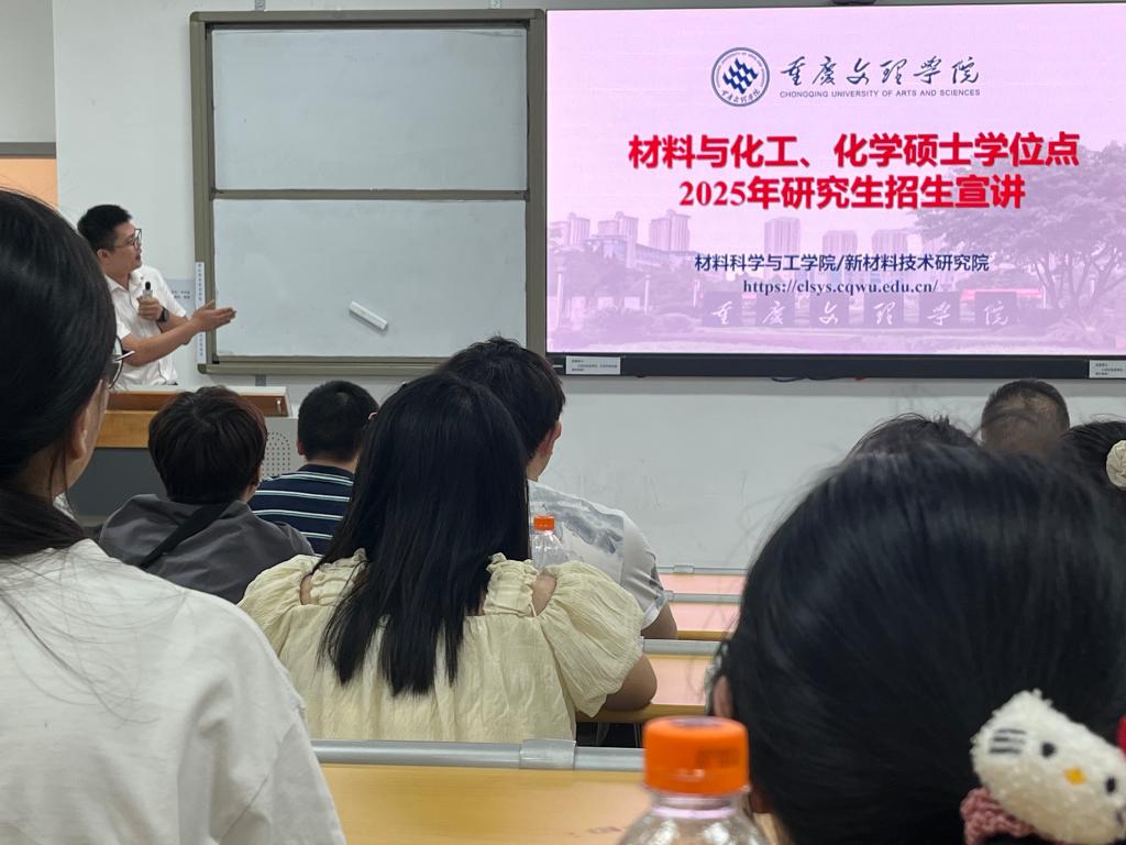 会议伊始,万象城awcsport官网副院长向文军向重庆文理学院研招教师代表团的到来表示热烈欢迎。随后,重庆文理学院材料与化工学院教师代表、生物与药学院教师代表、资源与环境学院教师代表分别就各自学院的相关简介、学院办学特色、专业目录与考试科目、奖励政策、招生培养计划等方面进行了详细宣讲。值得一提的是,各学院均以其卓越的科研实力和丰硕的成果著称,拥有一支高水平的教师团队和先进的实验设备,不仅能为学子们提供广阔的学术平台,还设有多种奖学金,激励学生勇攀科学高峰。