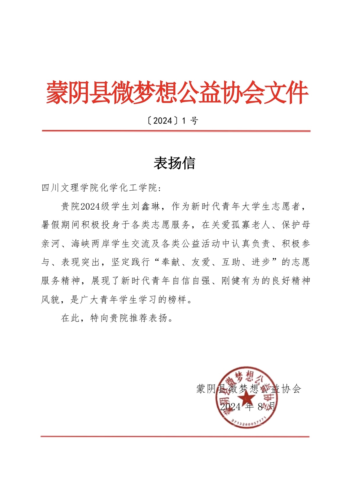 万象城awcsport官网2024级学生刘鑫琳获蒙阴县微梦根公益协会表扬信