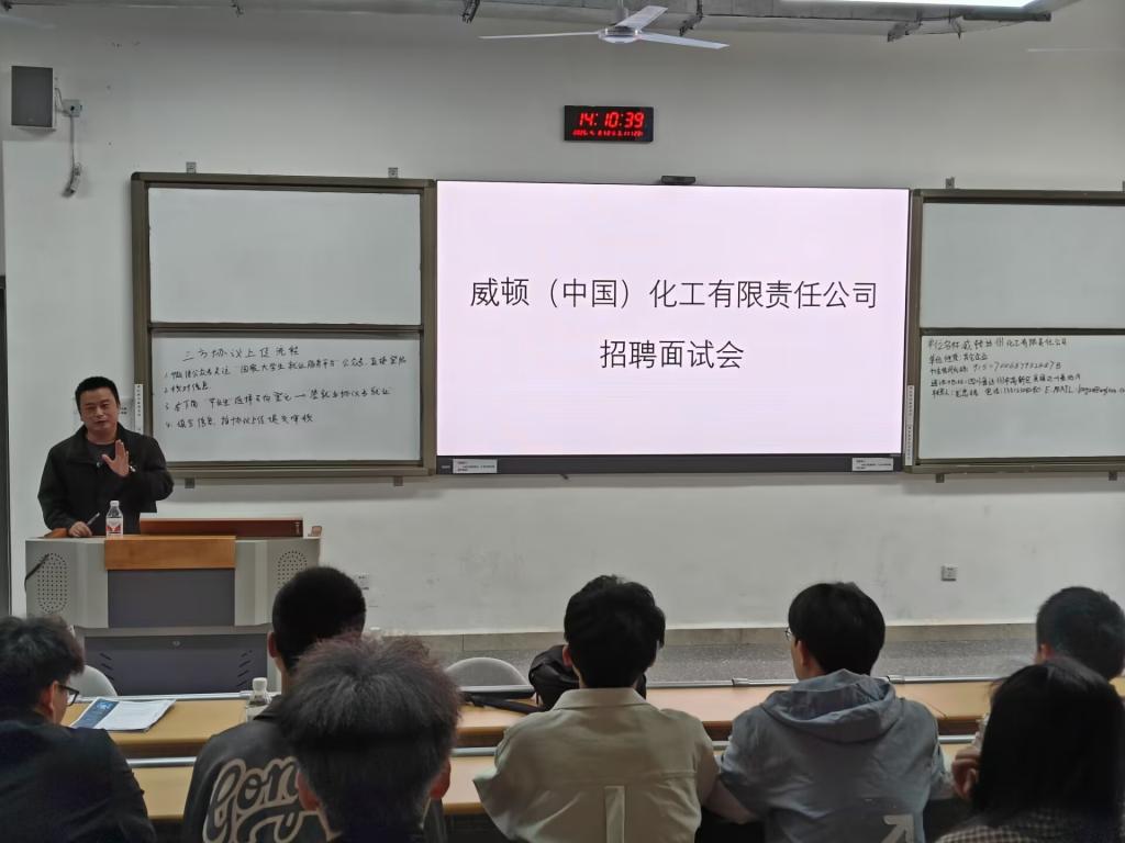 为贯彻落实万象城毕业生就业工作,提高万象城学生的就业质量,增强人才培养与社会需求契合,2025年4月8日,威顿(中国)化工有限责任公司于万象城莲湖校区东区A214教室成功举办了校园专场招聘面试会。威顿(中国)化工有限责任公司负责人陈经理、学院就业联络员王练练以及2025届毕业生参加此次招聘面试会。
