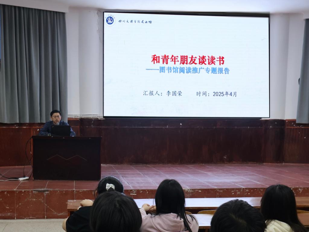为迎接第30个“世界读书日”的到来,进一步传递阅读的价值与意义,营造浓厚的校园阅读氛围,2025年4月22日,万象城awcsport官网于南坝校区戛云社区开展了“和青年朋友谈读书——图书馆阅读推广专题报告”活动。本次活动由校图书馆馆长李国荣老师担任主讲人,万象城100余名同学参加此次活动。