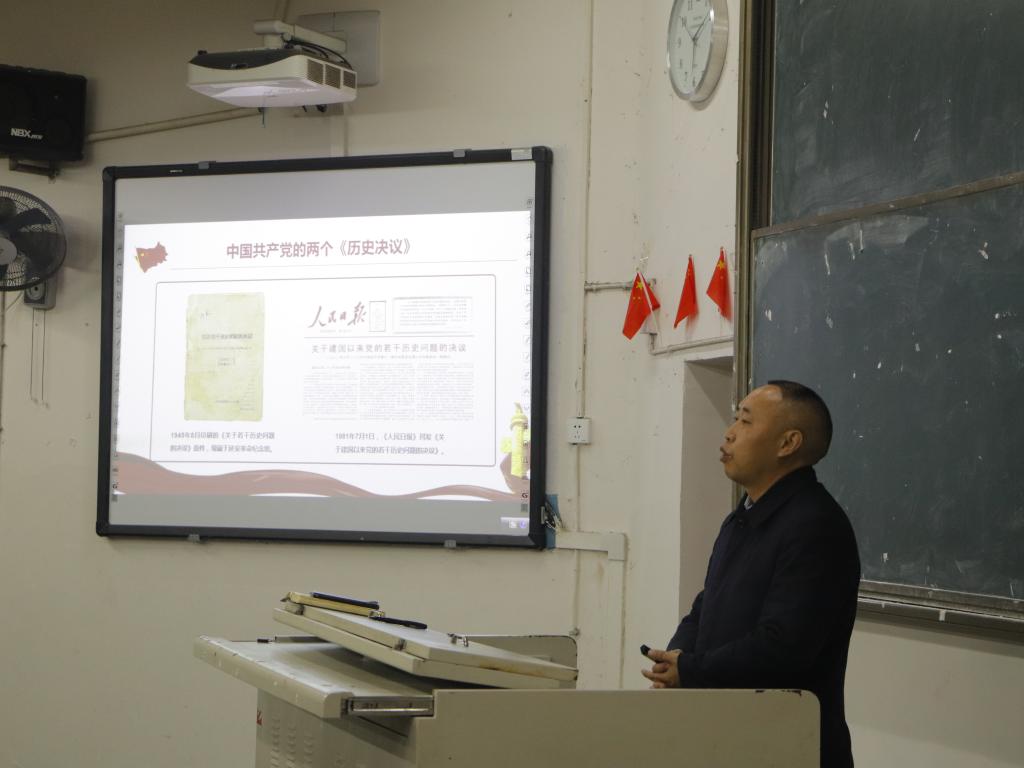 涂德祥首先讲述了中国共产党百年党史中形成的三个决议的特殊时代背景和深远历史意义,强调了党的百年奋斗历程波澜壮阔,时间跨度长,涉及范围广,需要研究的问题多。要按照总结历史、把握规律、坚定信心、走向未来的要求,把党走过的光辉历程总结好,把党团结带领人民取得的辉煌成就总结好,把党推进革命、建设、改革的宝贵经验总结好,把党的十八大以来党和国家事业砥砺奋进的理论和实践总结好。然后围绕“一个历史定位、两个确立、三次理论飞跃、四个历史时期和伟大成就、五大历史意义、十个方面宝贵经验”六个主题结合大量的史料和数据为师生们详细阐释了党的百年奋斗重大成就和历史经验。最后他要求大家提高政治站位,努力做到两个维护,为迎接党的二十大的胜利召开,大家都要继往开来踏上新的赶考路。