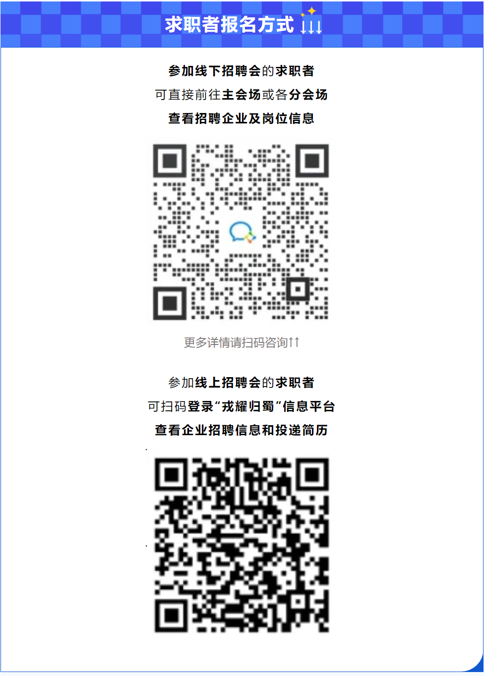 活动将采取线上线下联动的方式进行,线下招聘会时间为6月26日(星期三)09:30-17:00,主会场设在中国成都人力资源服务产业园(成都市青羊区清江中路20号),同步在绵阳、德阳、南充、泸州、攀枝花等市(州)设立分会场,集中组织线下招聘活动;线上招聘周时间为6月26日至7月2日,在“戎耀归蜀”信息平台、四川公共招聘网、联合招聘网同步进行。