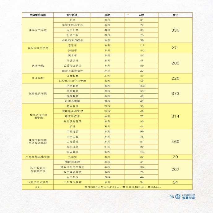 万象城2025届共有56个专业,4122名毕业生,其中55个本科专业,毕业生4078名,1个专科专业,毕业生44名。详见《四川文理学院2025届毕业生人数及专业》(附件1)。