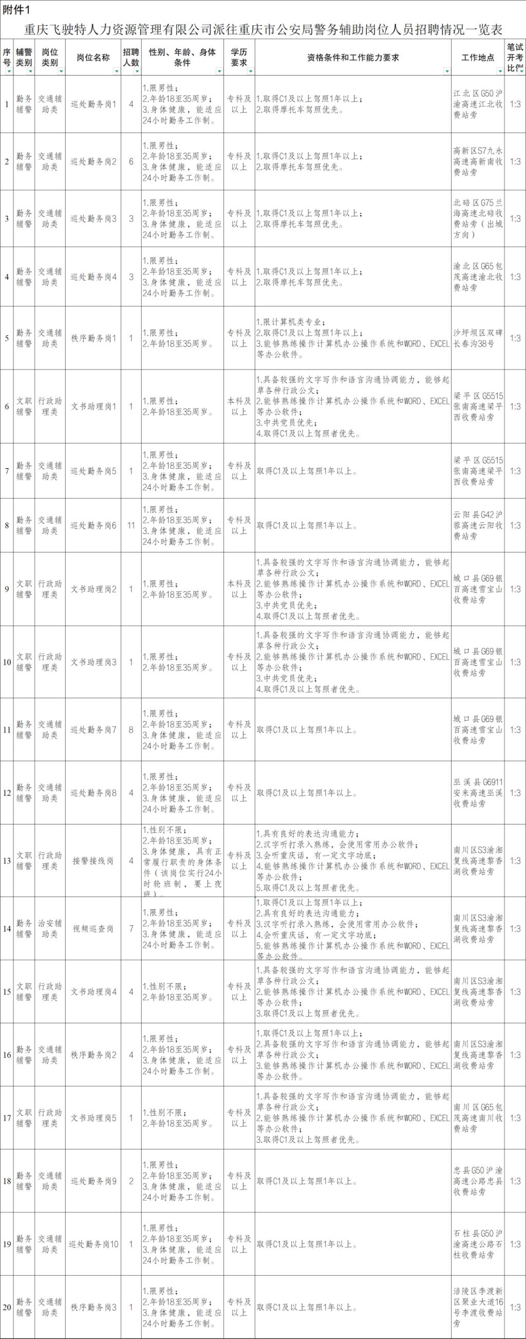 重庆飞驶特人力资源管理有限公司(以下简称飞驶特公司)采用派遣制,面向社会公开招聘99名工作人员,派往重庆市公安局从事警务辅助工作,现将有关事项公告如下:
