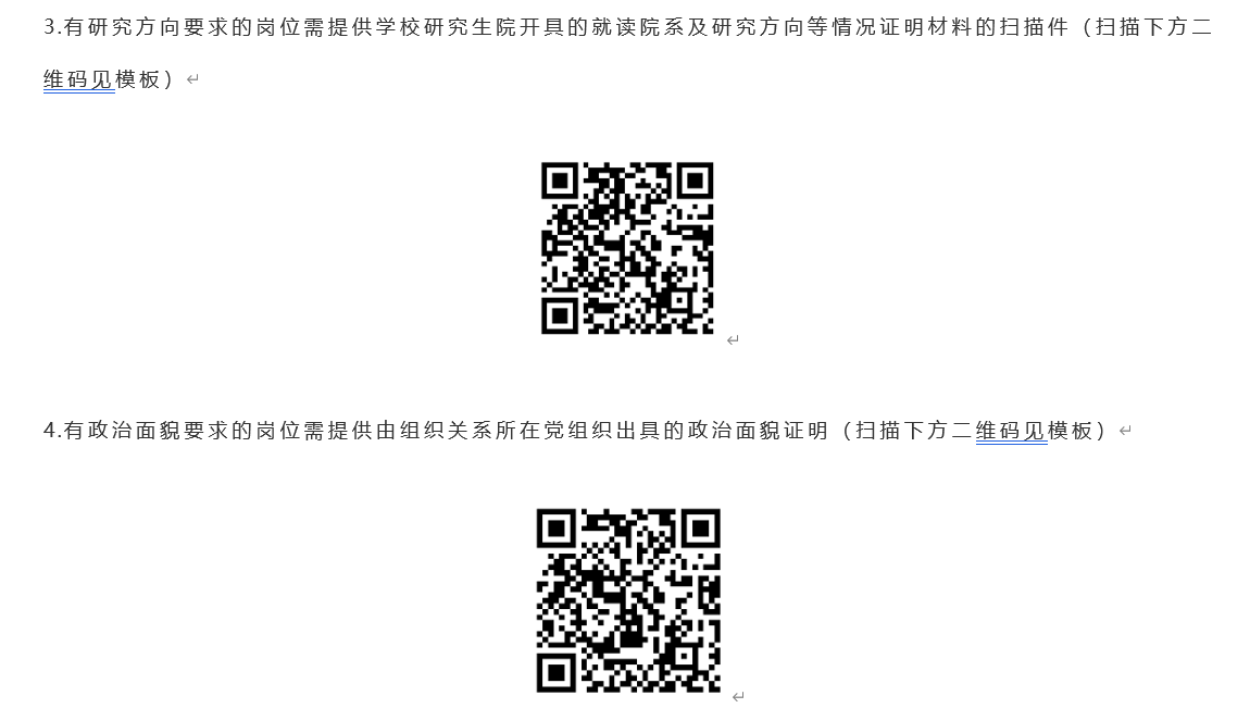 3.有研究方向要求的岗位需提供学校研究生院开具的就读院系及研究方向等情况证明材料的扫描件(扫描下方二维码见模板)
