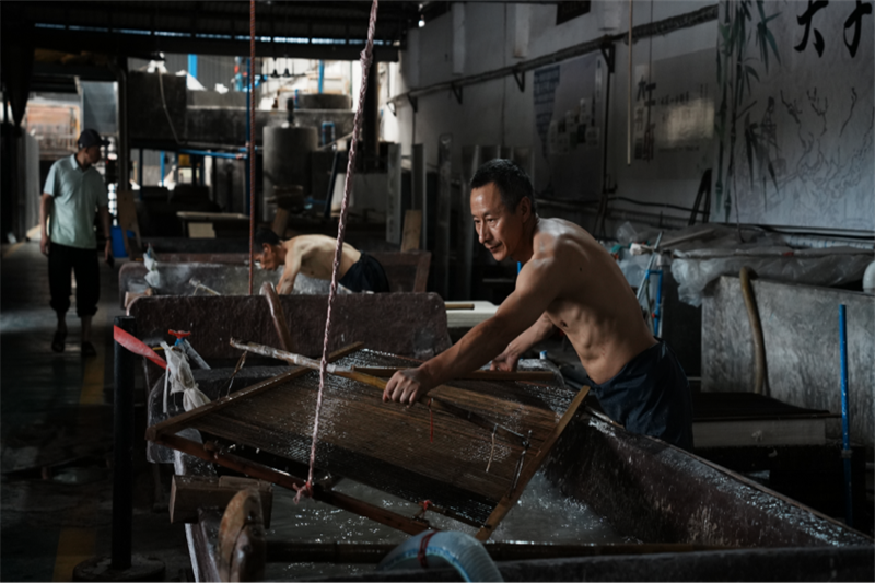 7月6日,团队聚焦国家级非遗“夹江竹纸制作技艺”,实地探访大千纸故里与杨湾纸坊。在大千纸故里,成员们深入了解了72道古法造纸工序的精妙,亲见匠人手工操作。在杨湾纸坊,成员们不仅感受到传统技艺的坚守,更了解到其积极拥抱电商直播等新业态,实现可持续发展,让“千年纸乡”焕发新生机。团队成员用镜头记录下匠人精神和纸艺之美。