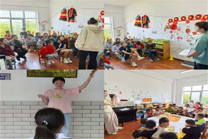 在支教活动尾声,志愿者们精心策划,将课程所学融入创作,带领孩子们在院坝举办了一场精彩的文艺汇报演出。演出在孩子们清澈的歌声中开场,表达了对世界的热爱与憧憬;朗诵节目《小梦想,大世界》诉说着对未来的期许;话剧《青山上的小太阳》则让孩子们通过角色扮演,深刻体会革命先辈的奋斗精神,感悟崇高革命文化。