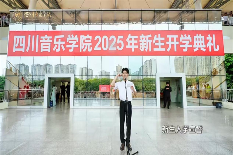 主看台上,朗诵者神采奕奕、自信从容,克服了恶劣天气的影响,以字正腔圆的语音语调、张弛有度的节奏把控和富有感染力的情感表达,圆满完成了朗诵,展示了传媒新生的专业水准。每个字、每个词、每段句,以声音为媒介,穿越风雨,将情感、理想与力量在操场不断传递,激励和鼓舞现场的每一个人。入学宣誓仪式上,传媒新生代表黄崇敬庄严领誓,新生们的誓言响彻天空,久久不息。这是大家对自己、对学校、对祖国的庄严承诺,最终内化为“我是川音人”强烈共识。