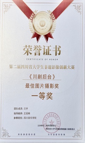 2025年11月21日,第二届四川省大学生非遗影像创新大赛颁奖典礼在四川电影电视学院圆满落幕。伟德bv国际体育传媒学院2024级影视摄影与制作专业学生兰宇凭借摄影作品《川剧后台》,荣获图片摄影单元一等奖,展现了学院在非遗影像教育与创作领域的扎实成果。