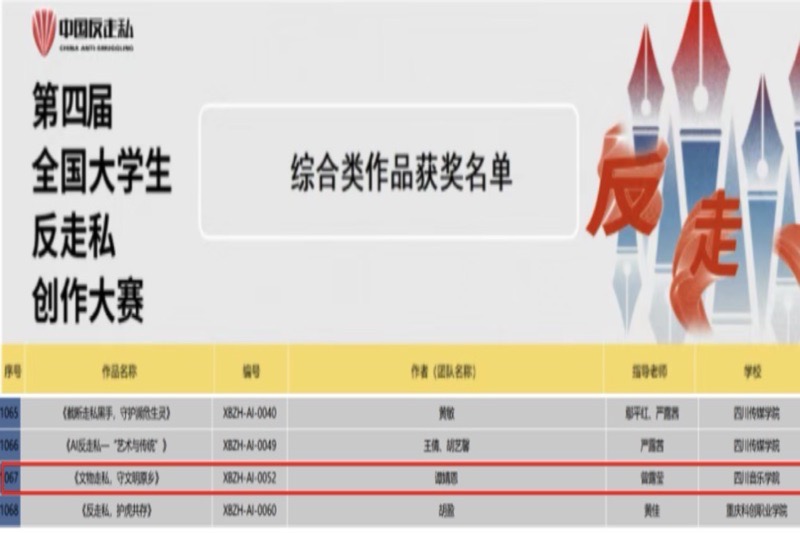 本次大赛由全国反走私综合治理调查研究中心主办,共吸引全国656所高校的12905件作品参赛。我院学子在此次大赛中取得的成果,标志着我院在反走私主题创作领域的初次尝试与积极探索,展现了同学们良好的专业素养、初步的实践能力和协作精神,也反映了我院教师在跨领域实践教学与创新指导中的支持与引领。