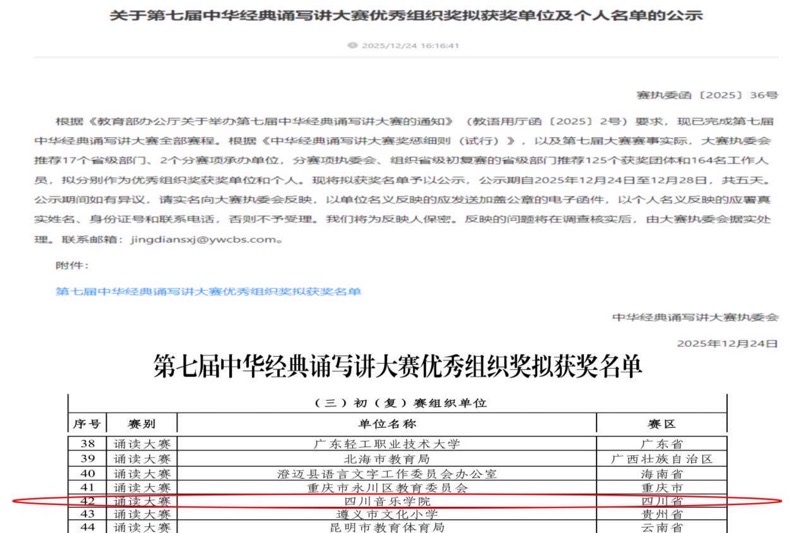 近日,由教育部、国家语委主办的第七届中华经典诵写讲大赛评选结果正式公布。伟德bv国际体育凭借系统化的赛事组织、专业化的活动承办、高质量的参赛成绩,荣获诵读大赛优秀组织(团体)奖,充分展现了学校在中华经典传承与语言文化教育领域的扎实成效。作为本次大赛校级承办单位及省级展演执行单位,川音传媒学院在赛事全过程展现了高度的专业素养与组织效能,为学校赢得这一重要荣誉作出了突出贡献。