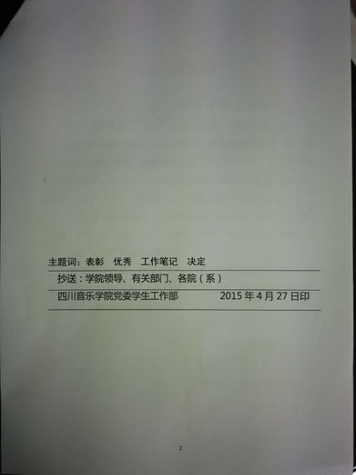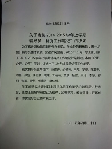 2015年4月30日,我系接到学院学工部下发的《关于表彰2014-2015学年上学期辅导员“优秀工作笔记”的决定》的文件,我系辅导员张旭、罗娜所完成的日常工作笔记被评为“优秀工作笔记”,受到学院学工部发文表彰。 二零一五年五月四日