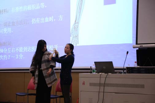最后,李文晓老师讲解了意外伤害和避险逃生的相关知识,着重为同学们讲解了现场急救的处理步骤,并介绍到了几种常见的止血方法,如加垫屈肢、填塞止血、止血带止血等等,同时演示了伤口包扎的几种常用方法,她利用纱布,生动形象地给同学们讲解如何运用不同的方法包扎伤口,还请同学上台扮演伤者,演示了手臂包扎方法和一些注意事项。在学习包扎知识和练习的过程中,李老师幽默风趣的讲解让整个报告厅都充满了欢声笑语,同学们也学到了创伤止血与包扎的基本技巧。