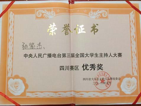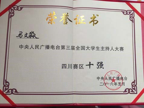 同学们: 我院2012级学生马文淼、2014级学生张紫杰,在5月29日、30日于四川南充西华师范大学承办的“第三届全国大学生主持人”大赛,凭借稳定的发挥从108名来自四川各高校同专业选手中脱颖而出,最终分别获得全川十强(马文淼)和大赛优秀奖(张紫杰)的喜人成绩! 祝贺他们,并预祝他们在今后的学习、工作和比赛中,积累更多经验,拓展更广阔视野,让自己对专业的那份追求稳步成长、稳步精进。 特予公示,以示鼓励!