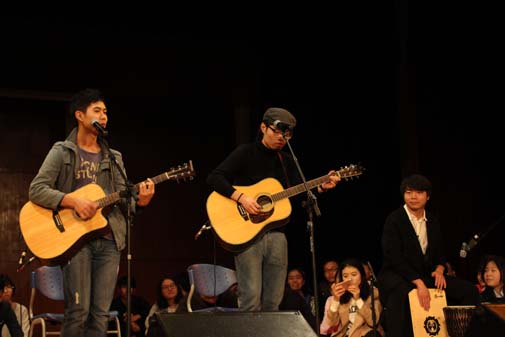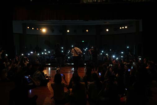 接着杨旭凯的出场更是让人眼前一亮。他用他那有故事但不世故的低沉嗓音,用他那特有的方式表达着他心里的民谣,唱出了他心底的声音。《白日梦》唱出了他心里最诚挚、最质朴的愿望;《一触即碎的生活》和《远方》,又唱出了他无奈却又无比渴望美好的生活夙愿;“想和你一起,听一听洱海的呼吸”,一句对大理的描写让同学们感同身受,甚至有了一种想去大理走一走的憧憬。而宋钊的幽默风趣,更是让全场的氛围进入高潮。他说“年轻就要燥一点”,也许在他的心里,虽洋溢着例如《皇后镇》这首歌的柔情,也充满着对未来轰轰烈烈的热情吧。
