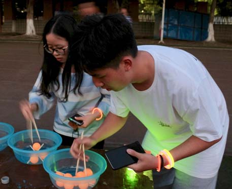 随着指令的发出,75名参与者一起出发,他们头戴荧光饰品,手握荧光棒,把整个校园装点成一片荧光闪耀的欢乐海洋,涌动的人群在跑道上形成了一道道亮丽的风景线。本次活动的规则是每个人需在最短的时间内跑完6圈,集到16枚印章即可完成游戏,结算时游戏印章超过一枚总时间减5秒,可叠加。与此同时,用时最短的前三名可获得丰富的奖品。跑道设立了4个盖章点:放胆来爆破、夹住乒乓球、趣味呼啦圈、单人踢毽子,只有完成了这4个盖章点设置的游戏任务才能盖到印章。这些游戏任务丰富有趣,唤起了选手们的童年记忆,激发了其参与游戏的热情,现场气氛迅速升温,达到顶峰。随着时间的推移,活动进行到了后期,一些跑者纷纷归来,他们用运动换回了一个个印章,他们奔跑的身影为校园静谧的夜晚画上了一抹绚丽的色彩。活动的最后,所有参与者留影纪念,用镜头定格住意义非凡的时刻。荧光夜跑是近期流行的一项运动,被称为“地球上最闪亮的赛跑”,它以“绿色•健康•运动”的宗旨号召高校学生及社会全体通过慢跑这一具有青春、活力、健康的运动方式强健身心,以提倡全面运动将健康生活的理念传递给周围每一个人。今晚的荧光夜跑活动在愉悦的氛围中落下帷幕。此次活动不仅增强了学生的身体素质、磨练了学生的顽强意志、增进了学生间的友谊,更彰显了青春活力与澎湃激情。锻炼身体需要持之以恒、渐进而行,而不是一时之功。让我们荧光不灭、能量不减、激情满满、奔跑永恒!