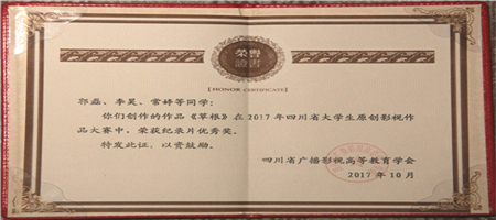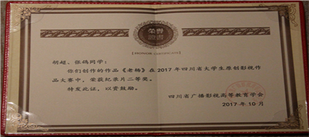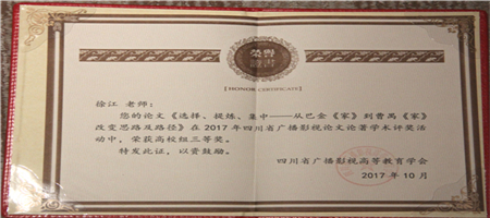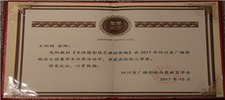 我院副院长王利剑副教授编著的教材《电视摄影技艺教程新编》与徐江老师撰写的学术论文《选择、提炼、集中——从巴金<家>到曹禺<家>改变思路及路径》获得2017年四川省广播影视论文论著学术评奖活动三等奖,广播电视编导专业胡超、张鸽同学创作的作品《老杨》和郭磊、李昊、常婷同学创作的作品《草根》分别获得2017年四川省大学生原创影视作品大赛纪录片组二等奖和优秀奖。