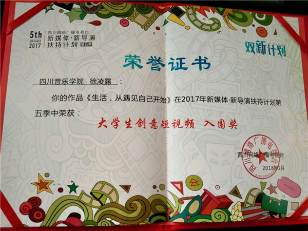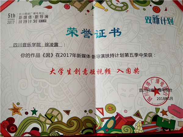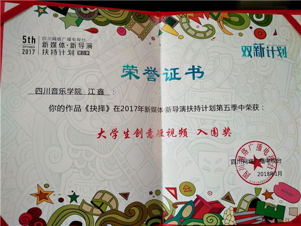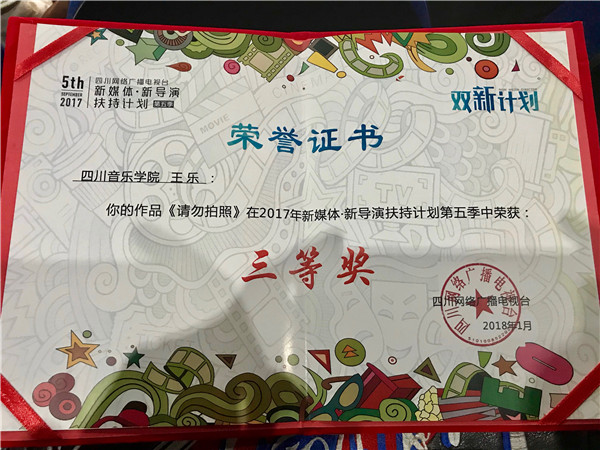 2018年1月11日,由国家新闻出版广电总局、四川省新闻出版广电局指导,四川网络广播电视台主办,四川广播电视台网络传媒中心、四川电视台影视文艺频道承办,四川省广播电视节目制作协会协办的“2017新媒体·新导演扶持计划第五季”颁奖礼在成都峨影1958电影城如期举行,二十部优秀作品获得殊荣。 其中,由我院学生王乐导演的作品《请勿拍照》获得大学生短片剧本征集与投资拍摄单元三等奖、专业老师赵源获得优秀指导老师奖,伟德官网获得院校组织奖。本次“双新计划”获得的奖项充分展现了我院学生扎实的专业功底和优秀的创作才能,也体现了伟德官网良好的组织能力。 新媒体·新导演扶持计划(简称“双新计划”)是由四川网络广播电视台主办的一项长期导演扶持计划,2015年被国家新闻出版广电总局列为重点推广项目。该活动借助电视台优势资源与高校合作,为影视传媒专业大学生和青年导演提供专业技术指导与资金支持,致力于发掘和培养优秀的影视从业者,为中国影视行业输送新生力量。 希望我院学子可以再接再厉,加强自身专业素养,培养自身创作能力,多出优秀的作品,在以后的比赛中再创佳绩。 撰稿人:传媒学院学生会宣传部 曲欣泽 二零一八年一月十三日