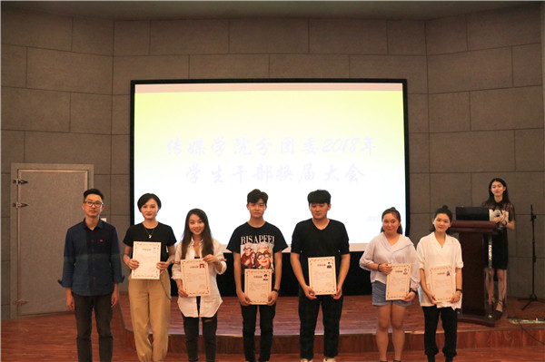 接下来党总支副书记后方为2017届学生会主席团及各部门部长颁发任职证明,场下掌声雷动,表达了对主席团成员和各部长为传媒学院工作热情奉献的高度认可。