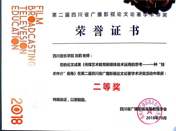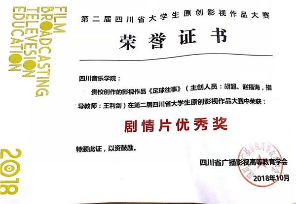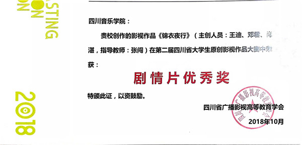 据悉,此次“学会奖”终审是在初审会件入围的130份作品的基础上进行终审。最终评出四川省大学生原创影视作品大赛(动画实验类)作品一等奖一名,二等奖二名,三等奖二名,优秀奖三名;四川省大学生原创影视作品大赛(记录类)作品一等奖一名,二等奖二名,三等奖三名,优秀奖五名;四川省大学生原创影视作品大赛(剧情类)作品二等奖三名,三等奖十名,优秀奖七名;四川省广播影视论文论著(论文类)作品特等奖一名,一等奖三名,二等奖四名,三等奖四名,优秀奖十名。传媒学院刘莉老师的论文《传媒艺术教育中新媒体技术运用思考——一种“技术中介”视角》获得论文类二等奖,李俊文老师的《当代播音实用教程》获得论著类优秀奖,学生王迪的影视作品《锦衣夜行》和胡超的《足球往事》获得剧情片优秀奖。