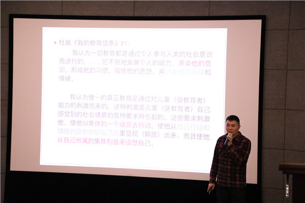 随后,王利剑副院长引用了杜威《我的教育信条》中的教育理念:认为教育是在不断地发展能力,熏染意识,形成习惯,锻炼思想,并激发感情和情绪的过程。认为教育是以集体的一个成员去行动,使他从自己行动和感情的原有的狭义范围里显现出来,使他从自己所属的集体利益来设想自己。