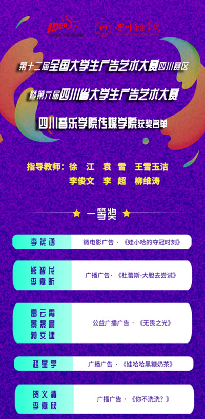 第十二届全国大学生广告艺术大赛四川赛区暨第六届四川省大学生广告艺术大赛近日落下帷幕,我院师生参赛成绩喜人、再创佳绩。由徐江、袁雪、王雪玉洁、李俊文、李超老师指导的38个作品在本次赛事中分获一、二、三等奖及优秀奖(其中一等奖5个,二等奖6个,三等奖12个,优秀奖15个)。 据统计,今年四川赛区通过大赛官网共计有省内55所参赛院校提交作品量达到20117件,经过各参赛学校初评后报送四川赛区组委会的参评作品达到6445件,经过8天的网络评审与复评,从总计6445件作品中评选出809件优秀奖作品和790件等级奖作品。作品数量较往年明显增长,公益类作品形式更加丰富,作品质量也更加成熟。 近年来,传媒学院坚持“以赛促学、以赛促教、学赛结合”的思路,积极承办、组织、参加各级各类专业赛事,取得了一系列丰硕成果。参赛师生通过积极参与专业赛事既加强了学术交流,又锻炼了实践能力、检验了教学效果,为强化师生创业创新实践应用能力、提升学院教学水平与综合竞争力奠定了坚实的基础。 全国大学生广告艺术大赛由教育部高等教育司指导、教育部高等学校新闻传播学类专业教学指导委员会、中国高等教育学会广告教育专业委员会共同主办,中国传媒大学、全国大学生广告艺术大赛组委会承办的全国高校文科大赛,大赛四川赛区暨四川省大学生广告艺术大赛有四川大学承办。作为中国高等教育学会《高校竞赛评估与管理体系研究》专家工作组发布的《中国高校创新人才培养暨学科竞赛评估结果》筛选的18个竞赛项目中仅有的2个文科类项目之一,是迄今为止全国规模大、覆盖高等院校广、参与师生人数多、作品水准高的全国性高校文科大赛。根据竞赛章程,本次获等级奖作品还将选送至全国组委会,参加第十二届全国大学生广告艺术大赛全国总评选的角逐。