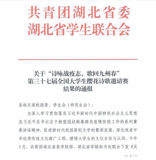 近日,共青团湖北省委、湖北省学生联合会印发了《关于“诗咏战疫志,歌回九州春”第三十七届全国大学生樱花诗歌邀请赛评选结果的通报》。通过精心组织、广泛动员、公开征集、自主申报、专家评审、网络公示等环节,川音传媒学院播音与主持艺术专业2018级刘逸楠同学获得本次活动朗诵组三等奖,2018级潘佳怡同学,2019级袁嘉蔚、武朝欣同学获得朗诵组优秀奖。 全国大学生樱花诗歌邀请赛由共青团湖北省委、湖北省学生联合会主办,共青团武汉大学委员会、全国大学生文学社团联盟承办,至今已成功举办36届。本届樱花诗赛自启动以来,得到全国高校众多诗歌爱好者的积极响应,创作组收到了807所高校的4802份作品,朗诵组吸引了234所高校的1130组选手报名参赛,参赛规模创历史新高。活动以“歌咏战疫志,歌回九州春”为主题,旨在讴歌新型冠状病毒肺炎疫情防控阻击战中的大国担当、感人事迹,积极反映全面建成小康社会、实现第一个百年奋斗目标及脱贫攻坚决胜战中的突出成就,积极弘扬社会正能量,促进新时代校园原创诗歌文化的繁荣发展,增强大学生的文化自信与认同,弘扬社会正能量。 希望获奖同学珍惜荣誉、再接再厉,积极弘扬新时代精神,争当社会主义先进文化的传播者与践行者。 作者:传媒学院党总支 二〇二〇年十月八日