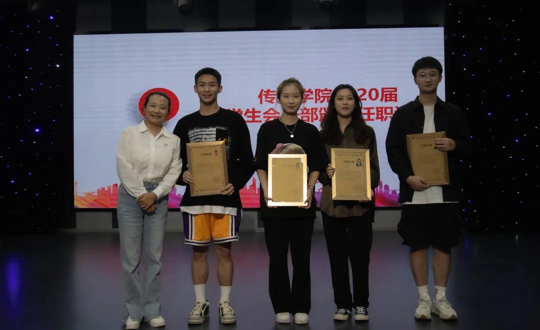 接下来,由传媒学院党总支副书记刘莉、传媒学院分团委书记、辅导员董航老师为2020届学生会主席团及各部门部长颁发任职证明,场下掌声雷动,表达了大家对主席团成员和各位部长一直以来为传媒学院辛勤付出的高度认可。