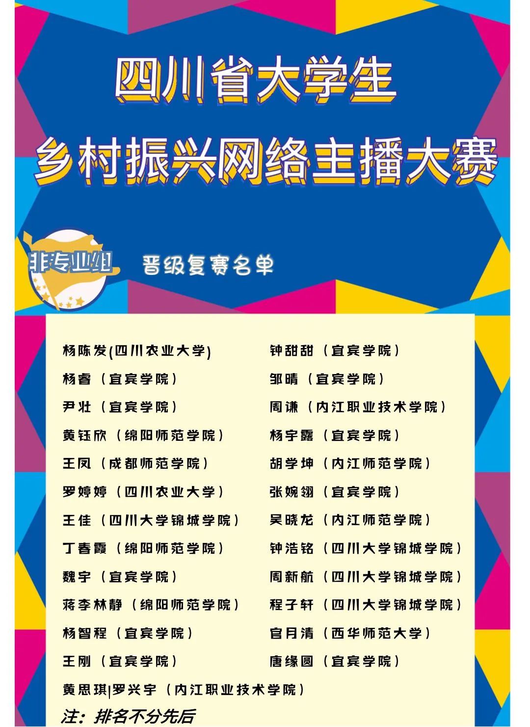7月27日,由四川省教育厅主办,伟德bv国际体育、四川欧美同学会·四川留学人员联谊会、四川知识分子联谊会承办,四川省高等教育学会播音与主持艺术专业委员会协办的“第一届四川省大学生乡村振兴网络主播大赛”非专业组初赛作品评审工作在伟德bv国际体育(武侯校区)智慧教室圆满结束。来自不同学校和专业的同学通过视频生动介绍了家乡特色,精彩纷呈。经过专家评审,25人入围大赛复赛,名单如下: