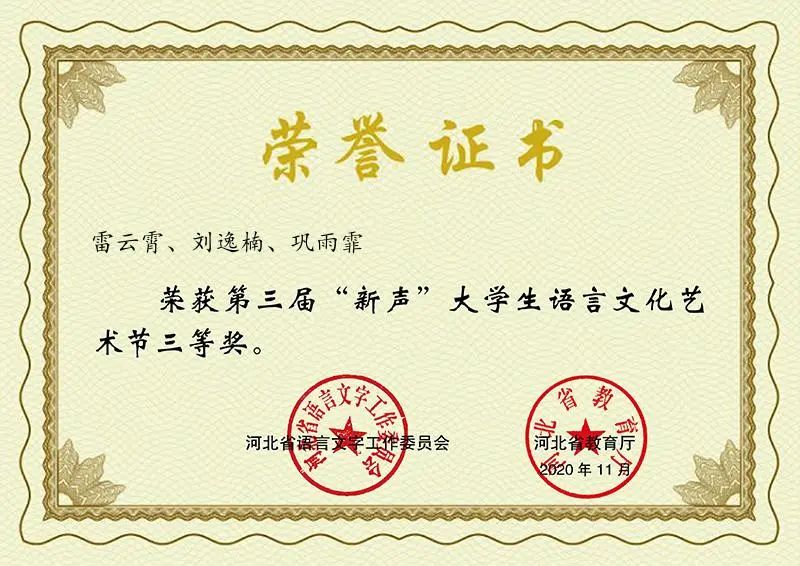 近日,第三届“新声”大学生语言文化艺术节的原创作品朗诵大赛决赛评选活动决赛通过网络举行。由传媒学院播音与主持艺术专业雷云霄、刘逸楠、巩雨霏同学朗诵的《白马石》经过大赛激烈的海选,从来自全国24所高校的28部作品从77所高校选送的267部作品中脱颖而出、跻身决赛,并在决赛中收获了三等奖(第十名)的好成绩。