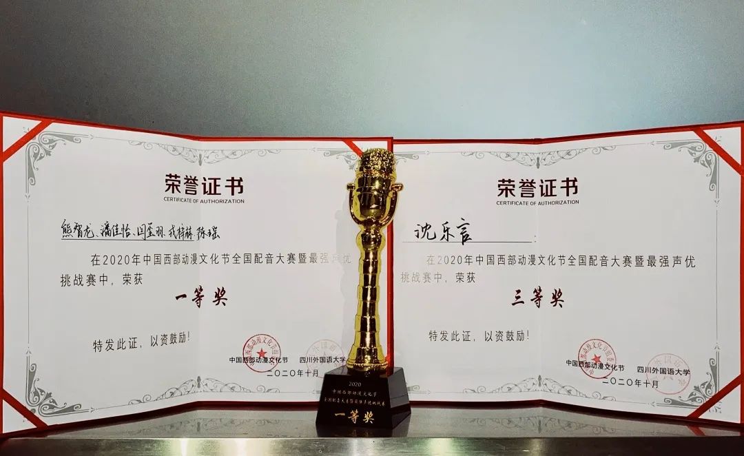 10月3日,2020全国配音大赛暨最强声优挑战赛总决赛在重庆璧山文化艺术中心落下帷幕,通过激烈角逐,由伟德bv国际体育传媒学院2018级播音与主持艺术专业熊智龙、潘佳怡、闫玺羽、戎梓赫、陈瑶同学组成的“得得得得队”团队获得本次大赛一等奖,2018级播音与主持艺术专业沈乐言同学获得本次大赛三等奖