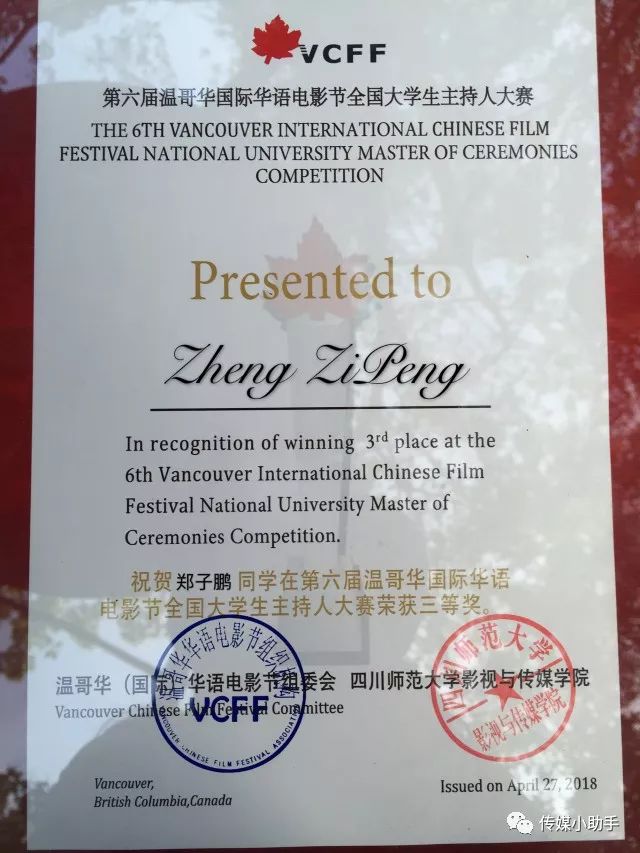 传媒学院学生郑子鹏在第六届温哥华(国际)华语电影节主持人大赛中获得三等奖