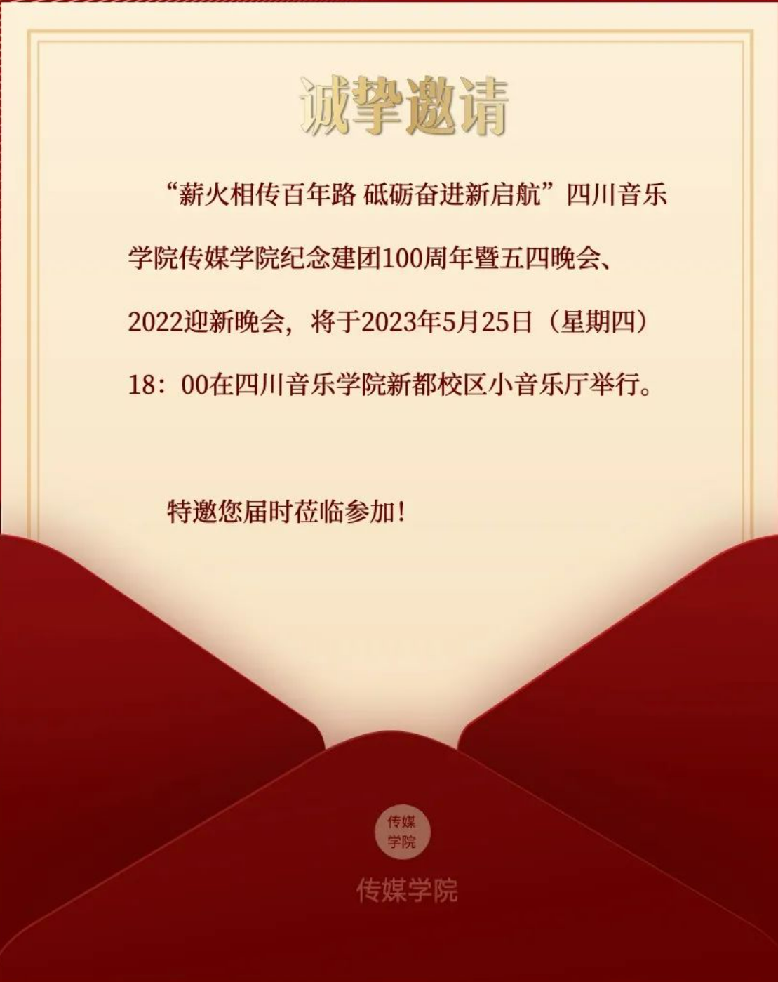 薪火相传百年路砥砺奋进新启航”伟德bv国际体育传媒学院纪念建团100周年暨五四晚会2022迎新晚会,将于2023年5月25日 (星期四)18:00在伟德bv国际体育新都校区小音乐厅举行,特邀您届时莅临参加!