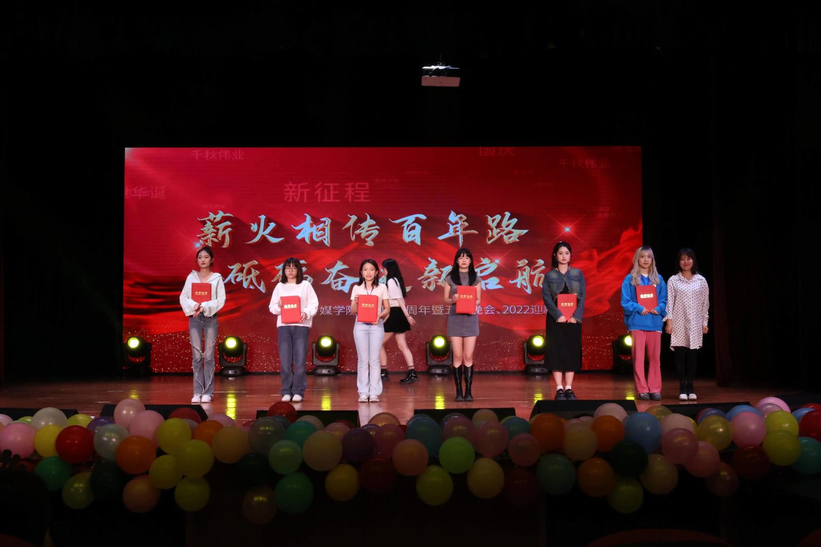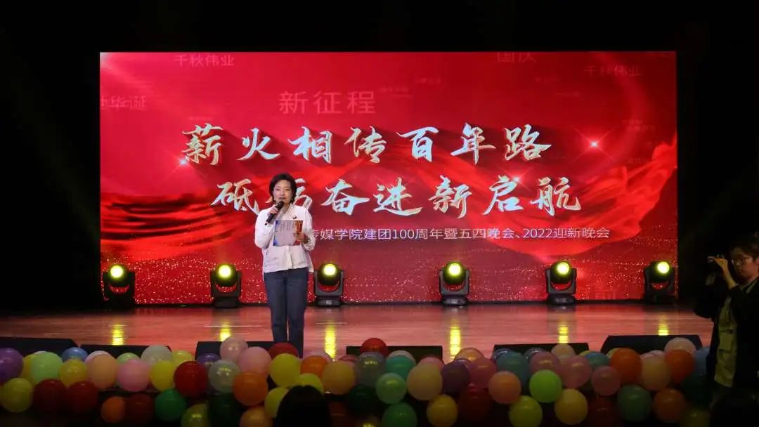 为弘扬爱国爱党主旋律,展现传媒学子风采,2023年5月25日,传媒学院于新都校区小音乐厅举办了2023年五四晚会暨庆祝共青团成立百年、迎新晚会。晚会在开始之前开展了为期三天的宣传活动,向全校师生发出了邀请。传媒学院师生与各院系同学一起参与了此次盛会。