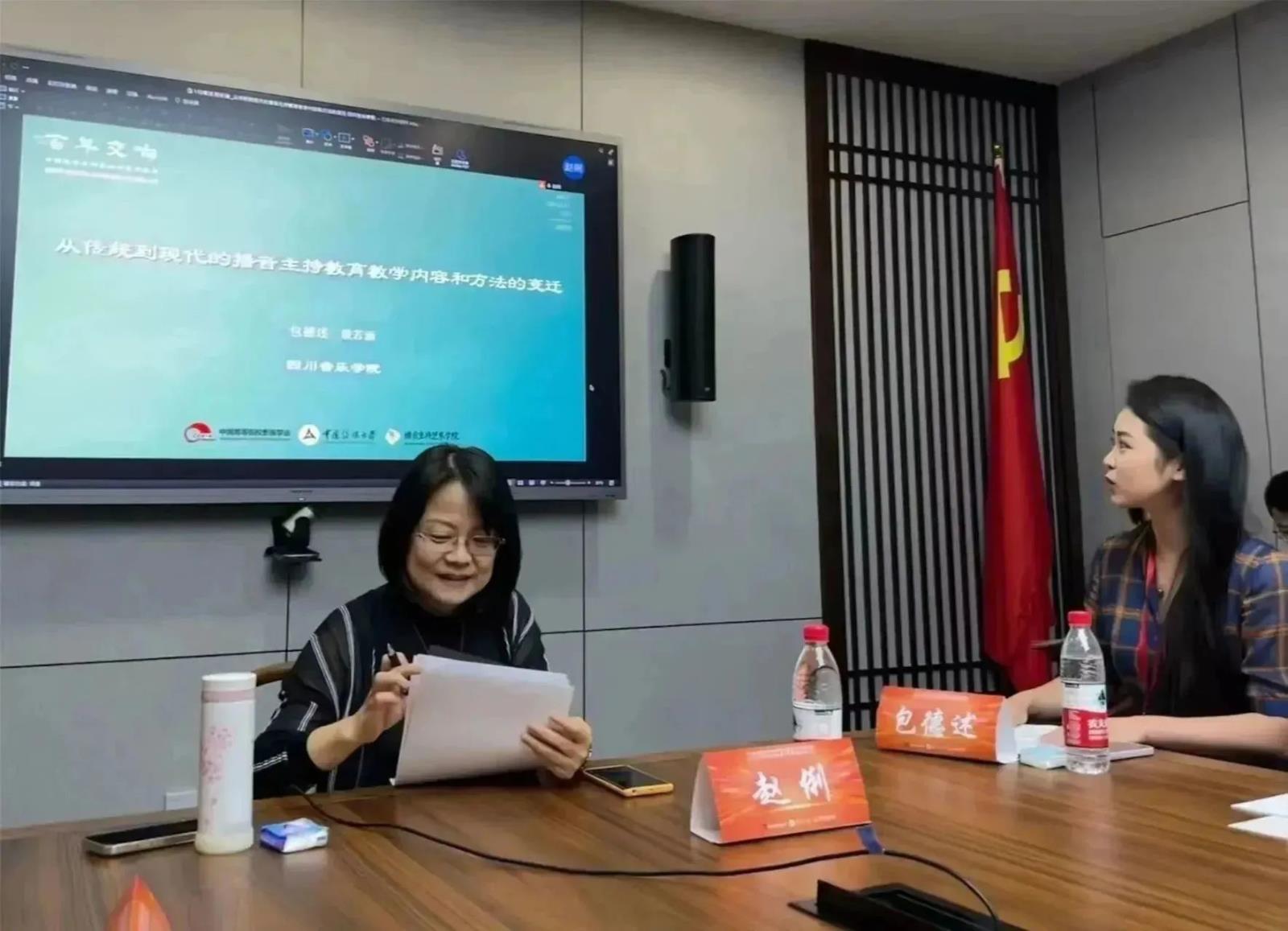 理事会成立大会结束后,进入播音主持专业委员会2023年学术年会主旨发言环节。多位专家学者在论坛上发表演讲。殷若涵老师、雍欣老师先后代表包德述院长、王雪玉洁副教授在学术论坛中宣讲论文。殷若涵老师在宣讲中以“从传统到现代的播音主持教育教学内容和方法的变迁”为主题,阐述了中国播音主持教育的历史发展、融媒体时代下主持人角色的变化、现如今时代下,播音主持教学应采用的办法及内容;雍欣老师在宣讲中针对传媒行业的发展和变化,引出了需要建立一套完整的播音主持人人才评价体系,提出相关优化措施,从而为高校以及培养播音主持人才模式提供相关借鉴与参考。