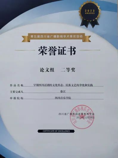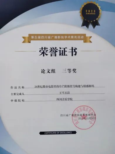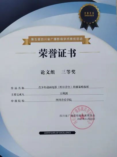 在第五届四川省广播影视学术推优活动中,我院共有四篇论文获奖,分别为:徐江老师的论文《早期四川话剧的文化形态:民族文艺的孕化和实践》荣获二等奖,包德述和李超老师的论文《媒介融合背景下播音主持专业学生素质提升策略》、王利剑老师的论文《青少年动画电影〈昨日青空〉传播策略探析》、王雪玉洁老师的论文《21世纪都市电影里的中产阶级符号构建与情感解码》荣获三等奖。