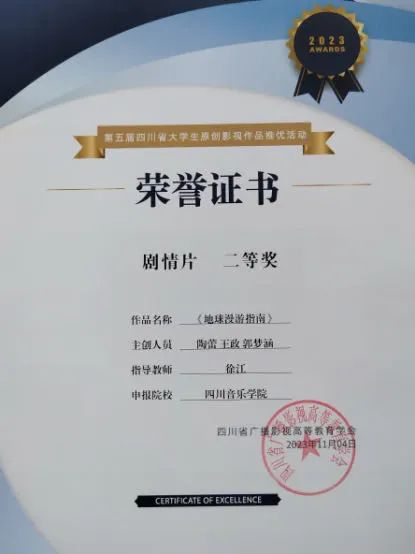 在第五届四川省大学生原创影视作品评优活动中,我院共有两部作品获奖,分别为:陶蕾、王政、郭梦涵三位同学主创的《地球漫游指南》荣获剧情片二等奖,卢诗源、韩子璇两位同学主创的《柳琴戏》荣获电视及新媒体作品三等奖。