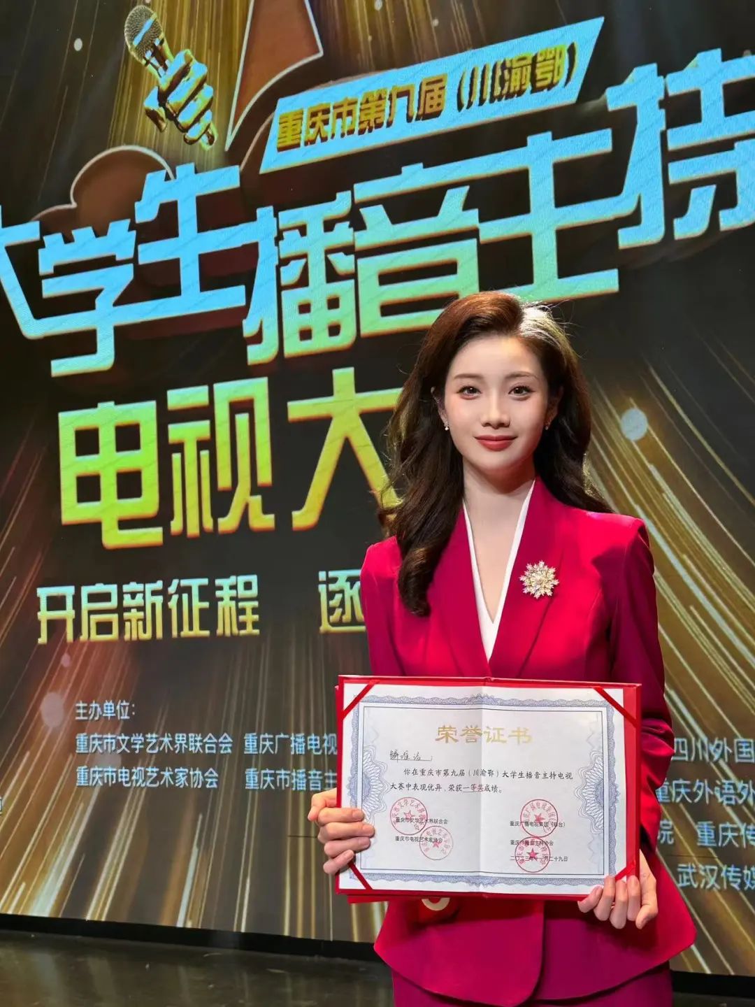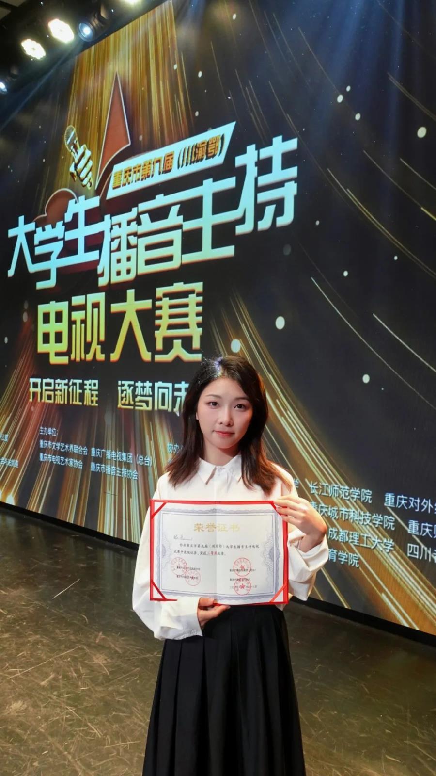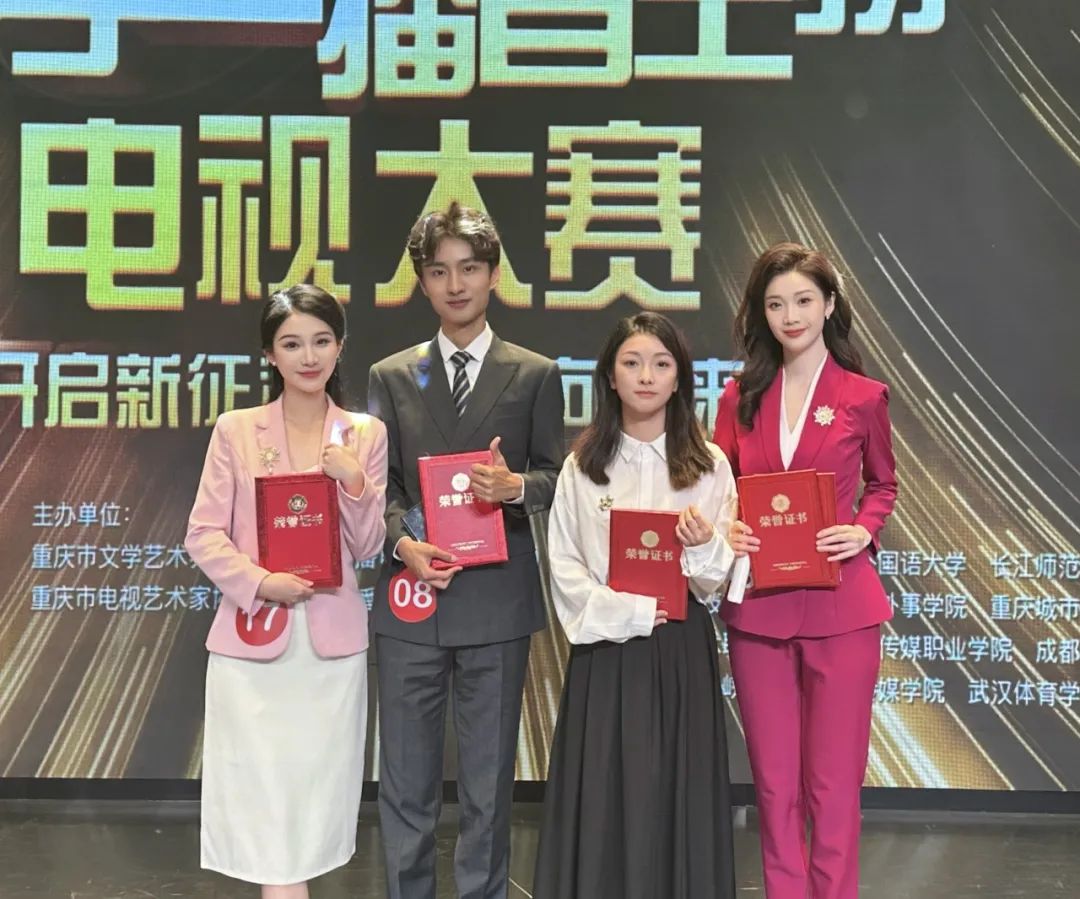 2023年11月23日由重庆市文学艺术界联合会、 重庆广播电视集团(总台)、重庆市电视艺术家协会、重庆市播音主持协会、重庆市广播电视协会播音主持专业委员会主办的第九届重庆市(川渝鄂)大学生播音主持电视大赛总决赛在重庆文联落下帷幕,川渝鄂三地共有34人进入大赛决赛,川音传媒学院共有2名同学参加决赛。最终经过激烈的角逐解唯洁同学获得一等奖和最佳形象气质奖,张乐同学获得三等奖,两位老师荣获指导教师奖。
