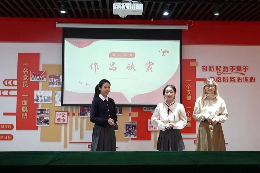 活动现场,来自伟德bv国际体育传媒学院播音主持艺术专业的同学给大家带来了优秀的语言作品。罗雨嫣同学朗诵了诗歌《在山的那边》,张心悦、秦千惠同学表演了配音《中国古诗词动漫》。标准的普通话和流畅的表达让在座的老师和同学赞叹不已。