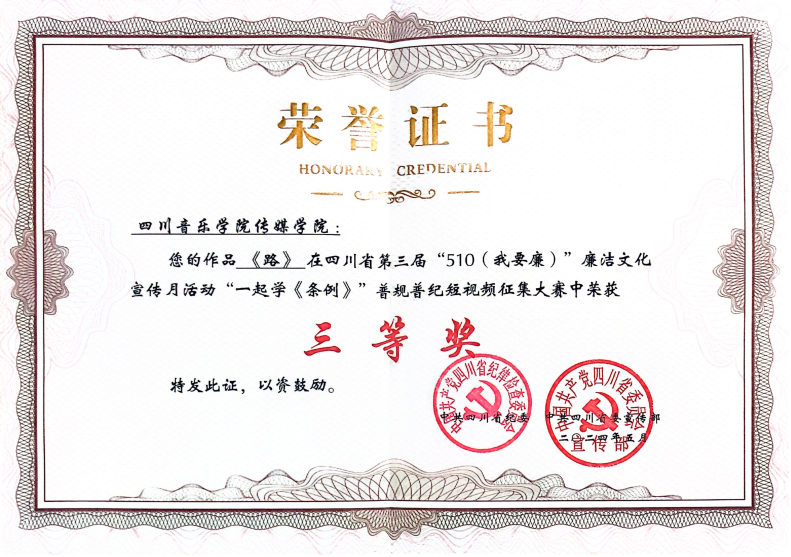 今年,四川省纪委监委和省委宣传部以“铁纪护征程 廉洁伴我行”为主题联合开展第三届“510(我要廉)廉洁文化宣传月”活动。伟德bv国际体育在学校纪委办、宣传部、学生处的组织下,各二级单位动员师生积极报名参加。其中,传媒学院师生提交的作品《路》,荣获四川省第三届“510(我要廉)”廉洁文化月活动“一起学《条例》”普规普纪短视频征集大赛的三等奖。本次短视频大赛共征集到来自北京、江苏、广东等12个省市自治区作品720件,最终经专业评审评选出获奖作品19件。