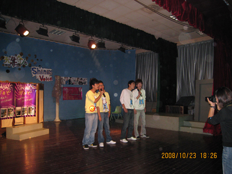 昨日下午18:00,在我系演播厅,“第一季 ‘Shining Voice’唱歌比赛”的决赛在这里进行。13名选手经过激烈角逐,分别获得了冠军(08级范思源)、亚军(08级徐晓萌)、季军(06级宫腾飞)、最佳上镜奖(07牟晓聪)、最佳创意奖(08级King组合),其余选手获得了优秀奖。 此次决赛是我系《先声夺人》系列活动之一,由2007级双语播音与主持班承办。在辅导员张旭老师的带领下,大家齐心协力,使这次活动获得圆满成功。 系主任王江应邀出席了此次决赛,并发表了热情洋溢的讲话。
