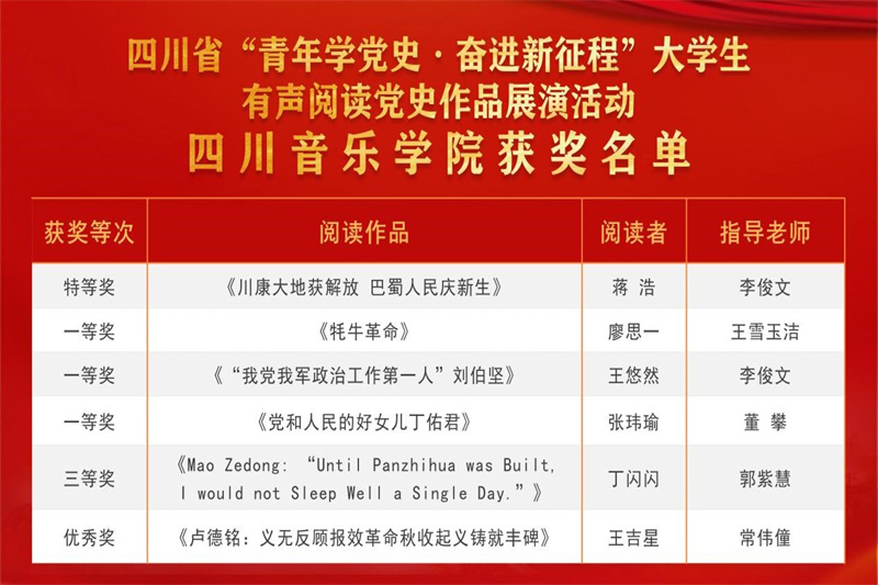 10月10日,由省委党史研究室、省委教育工委、团省委主办的四川省“青年学党史·奋进新征程”大学生有声阅读党史作品展演活动在成都举行。现场对评选出的优秀中英文阅读作品和组织奖获奖单位进行颁奖,激励广大青年从百年党史中汲取智慧和力量,书写青春华章。在校团委与传媒学院的悉心策划与精心组织下,伟德官网师生在此次活动中喜获佳绩,不仅荣获了一项特等奖的殊荣,还囊括了三项一等奖、一项三等奖、一项优秀奖以及优秀组织奖,充分展现了伟德官网师生在党史学习教育中的深厚底蕴与卓越成效。